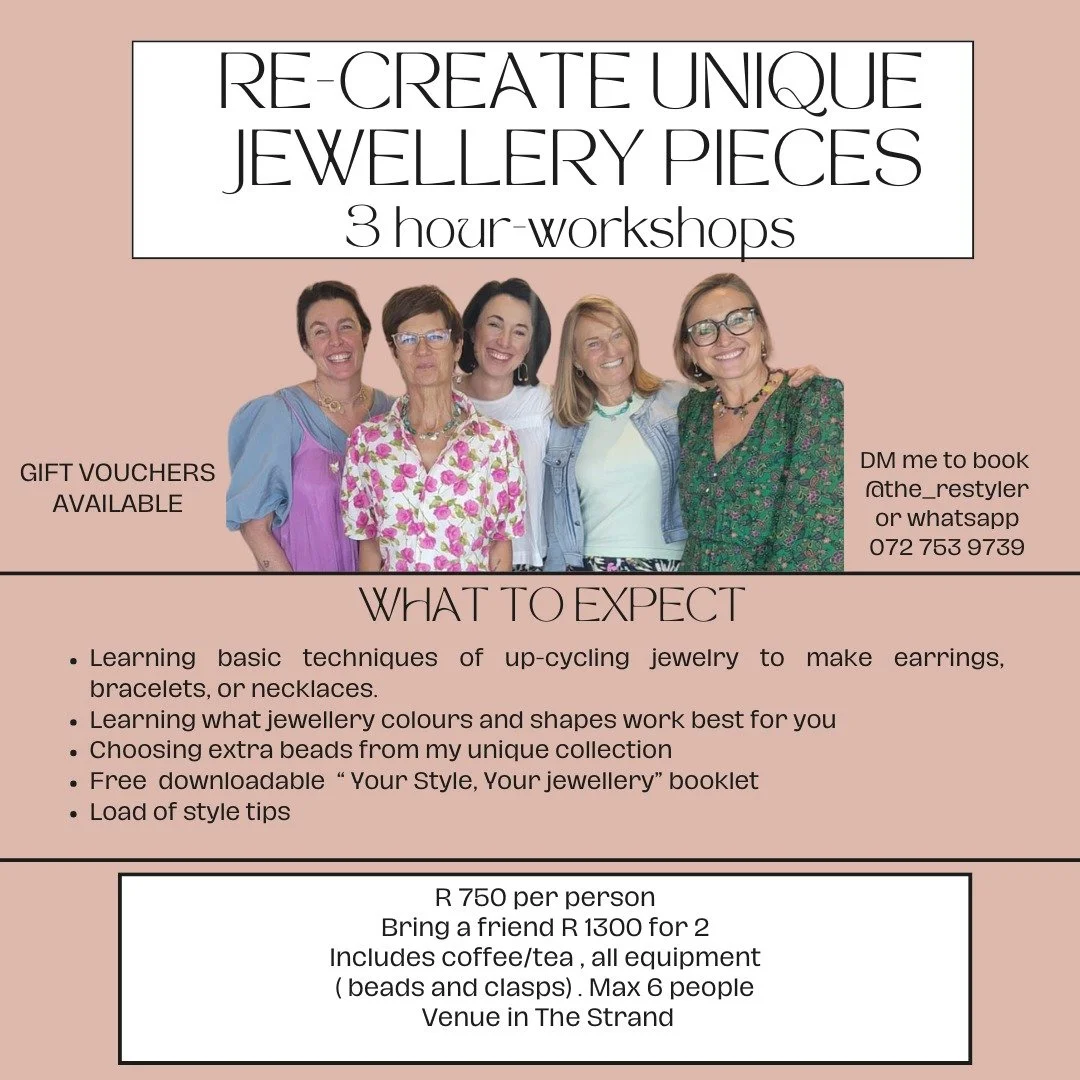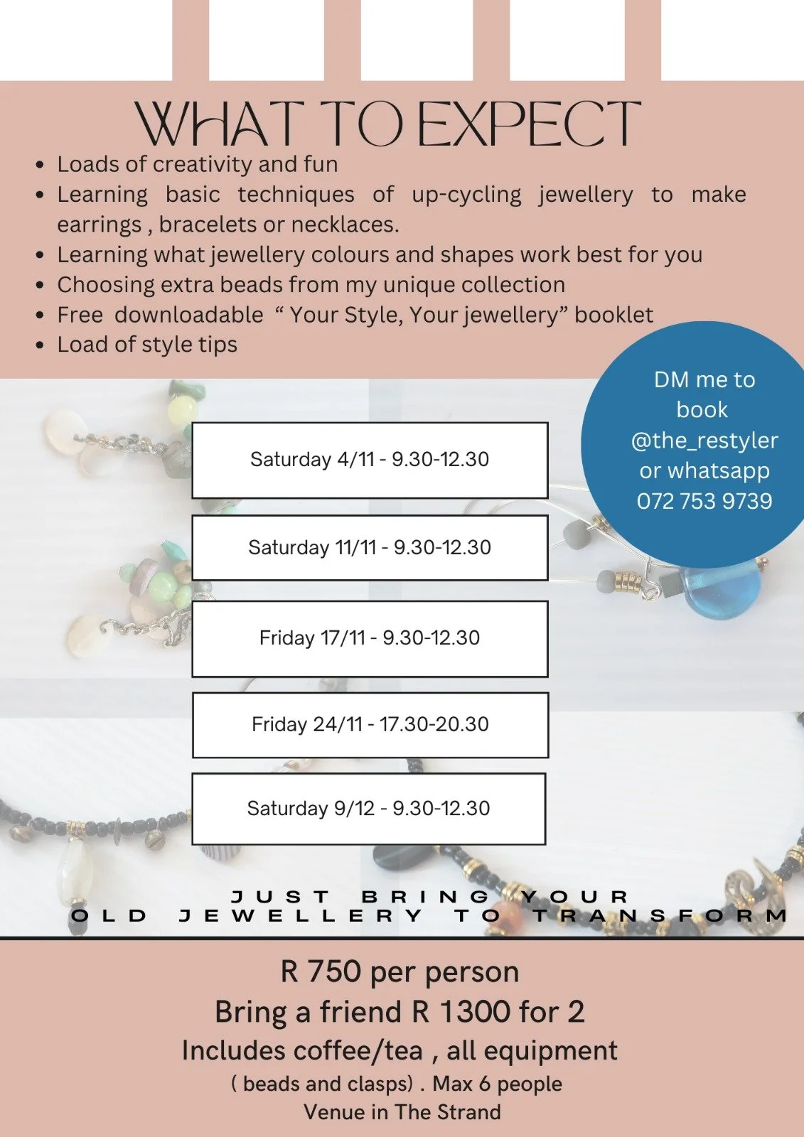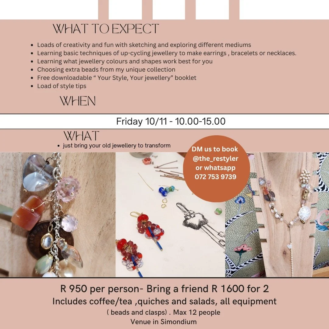 Nov 10 Up-Cycle Your Jewellery with The Re-Styler & Zuyda Van Dyk Friday, November 10, 2023 10:00 AM 3:00 PM The Re-Styler (map) Google Calendar ICS BOOK NOW View Event →