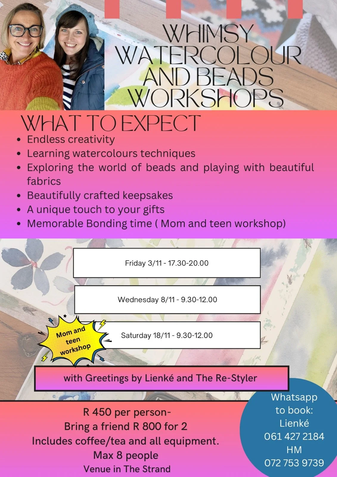 Nov 8 Whimsy Watercolours & Beads Workshops Wednesday, November 8, 2023 9:30 AM 12:00 PM The Restyler (map) Google Calendar ICS BOOK NOW View Event →